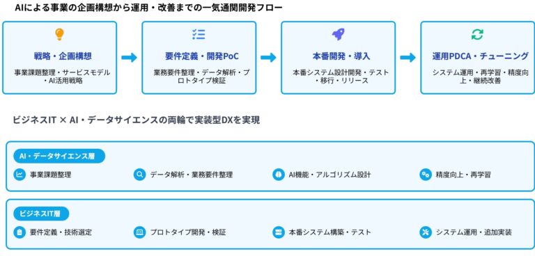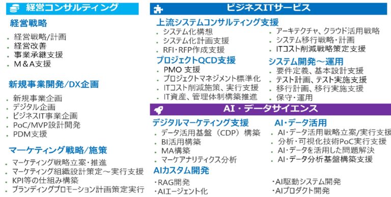 企業のDXを実現するため、経営コンサルティング、ビジネスITサービスをAI・データサイエンスをプロフェッショナルサービスとして提供しています